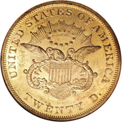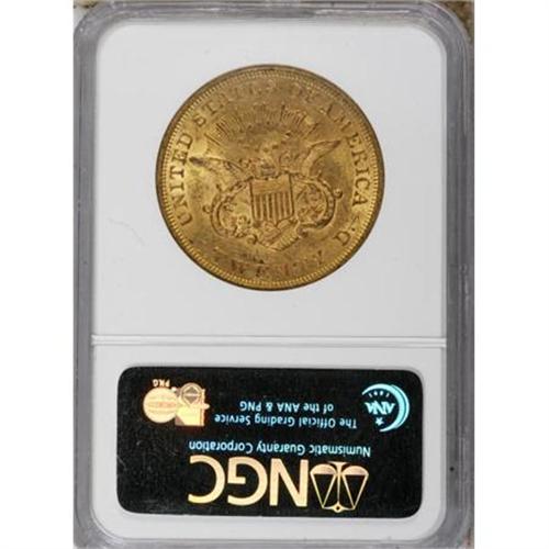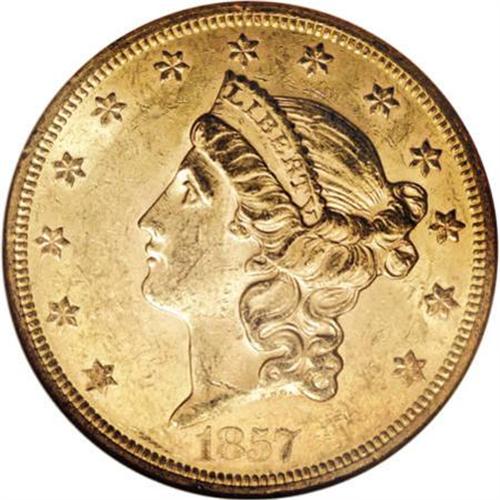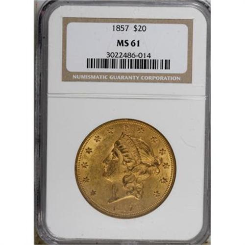 <B>1857 $20 MS61 NGC.</B></I> The 1857 double eagle is scarce in Mint State; NGC and PCGS combined have seen only about 70 Uncirculated examples. A well executed strike brings out good definition on this MS61 coin. Its peach-gold surfaces exhibit the most potent luster in the areas around, and in the interstices of, the design elements. Numerous tiny marks are evenly scattered over both sides. Census: 12 in 61, 14 finer (7/07).<BR><BR><B>Coin Engraver:</B> James B. Longacre<BR><BR><b>Shipping:</b> Coins & Currency (<a target="_blank" href="http://www.heritageauctions.com/common/shipping.php">view shipping information</a>)