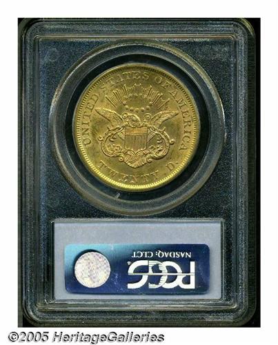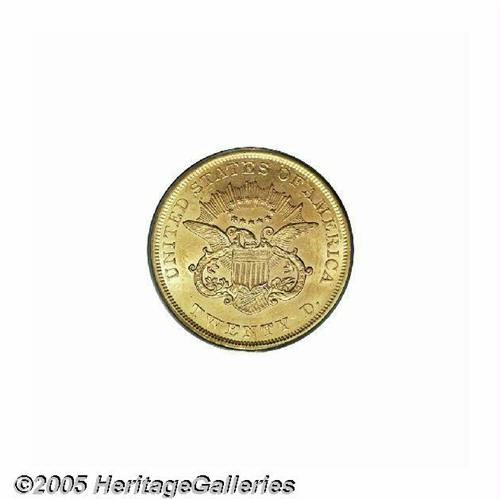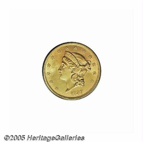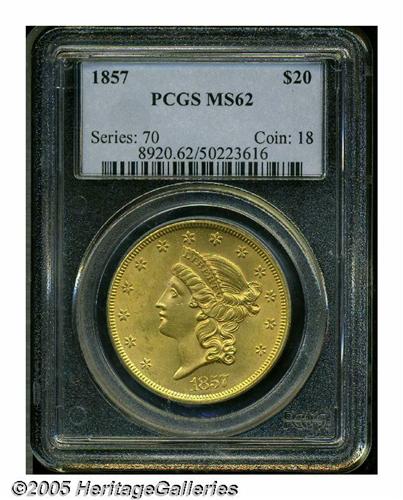 <B>1857<$20> MS62 PCGS.</B></I> The 1857 is a very scarce date, with most available specimens grading VF or XF, although AU's and an occasional Uncirculated piece are seen from time to time. In MS62 grade, that of the specimen in this lot, only 6 examples have made appearances in the major auction houses over the past 20 or so years, and 10 pieces graded higher have appeared. This coin displays soft luster, pleasing apricot-gold patina, and sharply struck design elements. A couple of light abrasions are noted on Liberty's cheek, along with wispy slide marks on the cheek and in the left (facing) obverse field. Population: 12 in 62, 3 finer (6/05).