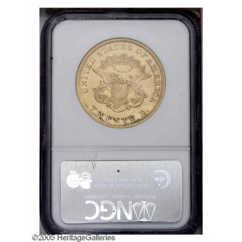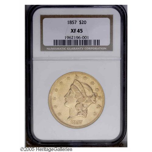 1857 $20 XF45 NGC. A bright straw-gold piece with a fe 1857[$20] XF45 NGC.