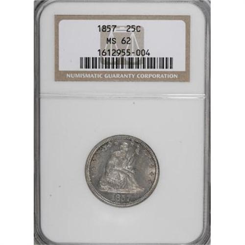 <B>1857 25C MS62 NGC.</B></I> NGC Census: (22/231). PCGS Population (24/176). Mintage: 9,644,000. Numismedia Wsl. Price for NGC/PCGS coin in MS62: $379. (#5442)<BR><BR><B>Coin Engraver:</B> Christian Gobrecht<BR><BR><b>Shipping:</b> Coins & Currency (<a target="_blank" href="http://www.heritageauctions.com/common/shipping.php">view shipping information</a>)