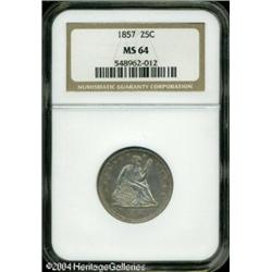 1857 25C MS64 NGC. Touches of light golden-brown t <B>1857 25C MS64 NGC.</B></I> Touches of light golden-brown toning adheres to lustrous surfaces that display well struck design elements on the obverse. On the reverse, weakness is seen on the eagle's right leg, and in the junction between the right wing and the upper left part of the shield. Small abrasions are apparent on Liberty's head, breasts, midsection, and legs. <BR><BR><B>Important notice:</B> Heritage usually auctions material at the rate of 200-250 lots per hour. On some occasions eBay Live bid software or the Internet may not be able to keep up with the pace of the auction. We recommend placing a realistic absentee bid now as insurance to avoid disappointment. Occasionally the auctioneer may eliminate or reject an eBay Live bid, and the auctioneer may also reopen a lot after the close of the eBay live bidding (usually because we missed an audience bid), and may reject your bid even if it shows you as the winning bidder. By bidding via eBay Live, you agree that Heritage may award the lot to another bidder at its sole discretion under the circumstances described above or any other reasonable circumstances. Since eBay bids are not shown to us until we open the lot on the floor, we treat those bids just like floor bids. In most cases the floor responds before the eBay bid is presented to us, due to Internet lag time, so for consistency we have made it a policy that floor bids are always considered first over tie eBay live bids. Also please note that all Heritage lots purchased through eBay Live carry a 20% Buyer's Premium. Please make sure you read the Terms and Conditions before you bid. This lot is being auctioned in conjunction with a live floor auction by Heritage Galleries & Auctioneers. All final auction and invoice information will be supplied by Heritage Galleries & Auctioneers, and all other information should be considered preliminary. Lot:5884
