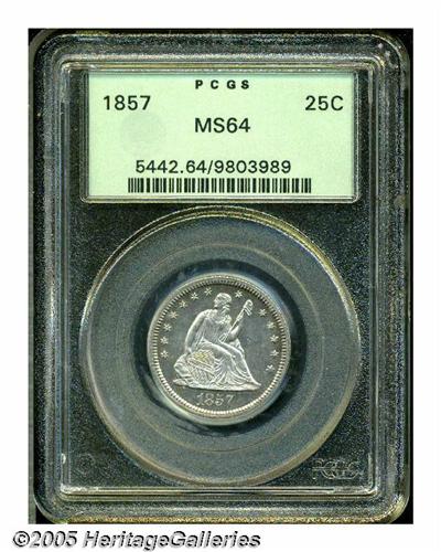 <B>1857<25C> MS64 PCGS.</B></I> Lustrous near-Gem example with golden peripheries. Struck from well polished dies, this piece exudes an eye appeal beyond its grade.