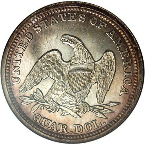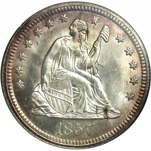 <B>1857<25C> MS65 NGC.</B></I> A bold strike and near-brilliant surfaces complemented by daubs of copper color at the borders characterize this extremely appealing and collectible example. All of the stars show their full central details. Liberty's face and gown, and the eagle's claws and wings, are all fully brought up. There is a small grease strike-though, as made, near Liberty's outstretched right (facing) foot, just above the date. The few abrasions noted, seen only under a loupe, are completely consistent with the Gem assessment from NGC, which has graded 32 pieces finer (3/06).