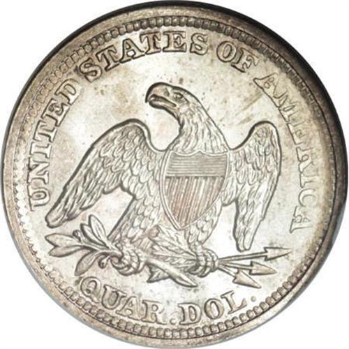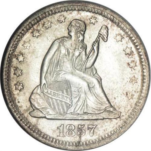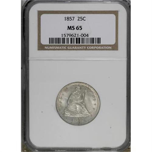 <B>1857 25C MS65 NGC.</B></I> A remarkable Gem with frosty silver luster and faint traces of pale gold toning on both sides. It is a lovely example with frosty surfaces and bold design features. The No Motto type is much more elusive than the With Motto type in high grades such as this. Census: 52 in 65, 59 finer (1/08).<BR><BR><B>Coin Engraver:</B> Christian Gobrecht<BR><BR><b>Shipping:</b> Coins & Currency (<a target="_blank" href="http://www.heritageauctions.com/common/shipping.php">view shipping information</a>)