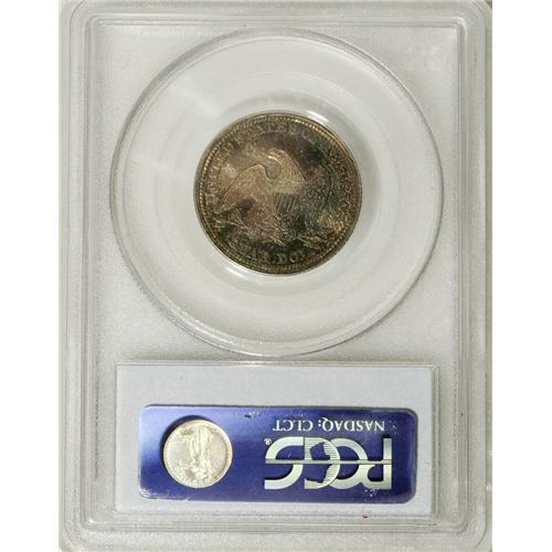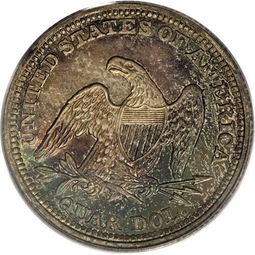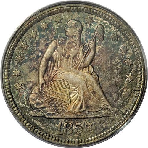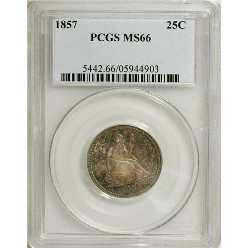 <B>1857 25C MS66 PCGS.</B></I> Dappled aqua and pink patina thickly coats both sides of this pretty type coin. Some of the obverse stars at the periphery are flatly struck, but there are no singular abrasions. Although the plentiful mintage approaching 10 million pieces ensures that survivors are plentiful today, this piece is one of 26 examples graded MS66, with only four coins finer (4/07).<BR><BR><b>Shipping:</b> Coins & Currency (<a target="_blank" href="http://www.heritageauctions.com/common/shipping.php">view shipping information</a>)