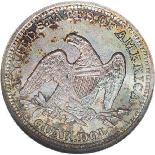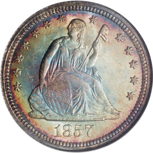 <B>1857<25C> MS67 NGC.</B></I> Blue-green, gold, and salmon-pink colors enrich this lustrous and intricately struck No Motto type coin. Close examination reveals sharp definition on all details including the obverse stars, Liberty's head, and the feathers on the eagle's wings and neck. Attractively preserved, and the finest available quality, since NGC and PCGS (as of 1/06) have certified just two pieces in higher grades, both as MS68. Census: 17 in 67, 1 finer.