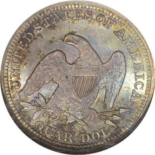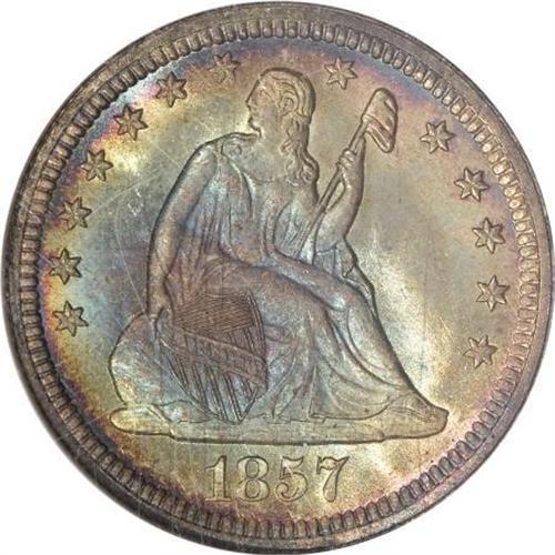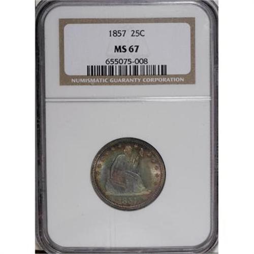 <B>1857 25C MS67 NGC.</B></I> Blue-green, gold, and salmon-pink colors enrich this lustrous and intricately struck No Motto type coin. Close examination reveals sharp definition on all details including the obverse stars, Liberty's head, and the feathers on the eagle's wings and neck. Attractively preserved, and the finest available quality, since NGC and PCGS combined have certified just two pieces in higher grades, both as MS68. Census: 18 in 67, 1 finer (11/07).<BR><I>From The Madison Collection.</B></I><BR><BR><B>Coin Engraver:</B> Christian Gobrecht<BR><BR><b>Shipping:</b> Coins & Currency (<a target="_blank" href="http://www.heritageauctions.com/common/shipping.php">view shipping information</a>)