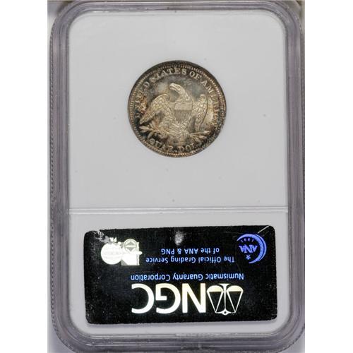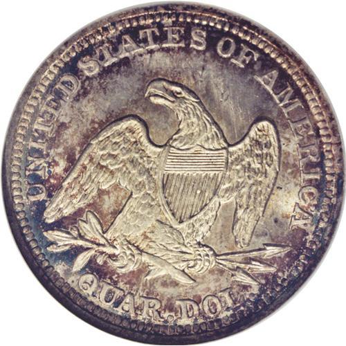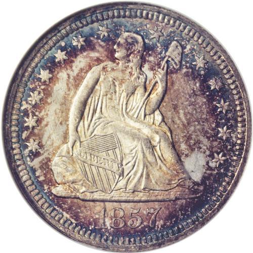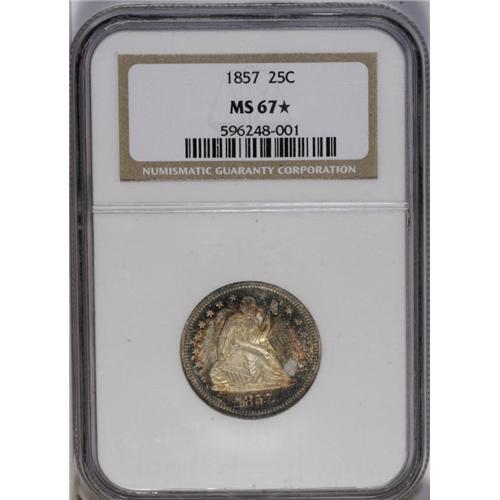 <B>1857<25C> MS67 <img border='0' src='http://www.heritagecoins.com/images/star.gif' width=10 height=10> NGC.</B></I> Even though the 1857 quarter dollar is considered a common date, high quality Mint State examples are not often encountered. Splashes of electric-blue and orange-gold color dominate this shimmering and carefully preserved Superb Gem. The stars and dentils are needle-sharp, although the fletchings and Liberty's chest shows moderate incompleteness of strike. Both sides show considerable reflectivity in the fields. Struck from clashed dies. There are no unusual die characteristics visible on this example. Population: 2 in 67 <img border='0' src='http://www.heritagecoins.com/images/star.gif' width=10 height=10>, 1 finer as MS68 without a star designation (6/06).
