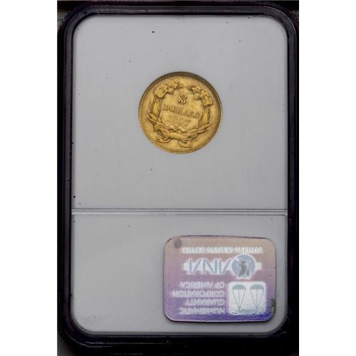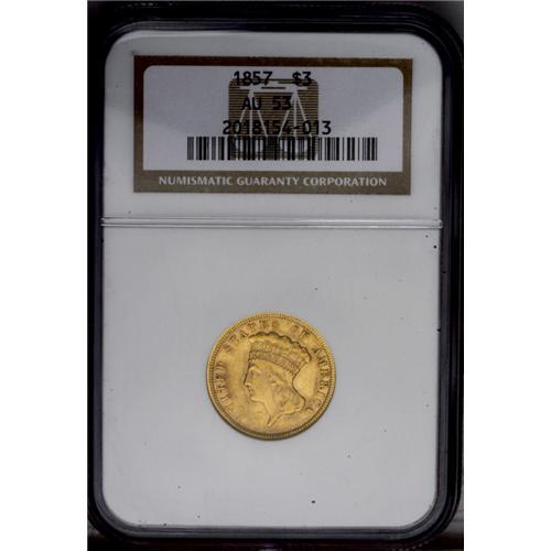 <B>1857<$3> AU53 NGC.</B></I> Rich orange-gold patina is imbued with traces of lavender and faded bluish colors. The design features are well brought up, though some localized flatness is noted in Liberty's hair and on the wreath. A small patch of fine scratches is seen near the N of UNITED.<BR><I>From The Steve Glenn Collection.</B></I> <BR><BR><B>Important notice:</B> Heritage usually auctions material at the rate of 200-250 lots per hour. On some occasions eBay Live bid software or the Internet may not be able to keep up with the pace of the auction. We recommend placing a realistic absentee bid now as insurance to avoid disappointment. Occasionally the auctioneer may eliminate or reject an eBay Live bid, and the auctioneer may also reopen a lot after the close of the eBay live bidding (usually because we missed an audience bid), and may reject your bid even if it shows you as the winning bidder. By bidding via eBay Live, you agree that Heritage may award the lot to another bidder at its sole discretion under the circumstances described above or any other reasonable circumstances. Since eBay bids are not shown to us until we open the lot on the floor, we treat those bids just like floor bids. In most cases the floor responds before the eBay bid is presented to us, due to Internet lag time, so for consistency we have made it a policy that floor bids are always considered first over tie eBay live bids. Also please note that all Heritage lots purchased through eBay Live carry a 20% Buyer's Premium. Please make sure you read the Terms and Conditions before you bid. This lot is being auctioned in conjunction with a live floor auction by Heritage Galleries & Auctioneers. All final auction and invoice information will be supplied by Heritage Galleries & Auctioneers, and all other information should be considered preliminary. Lot:2569 <BR><BR><B>Winning Notification and Billing:</B> After the FINAL session in this auction is complete, Heritage will send e-mail and snail mail invoices. This process normally takes several days. All final auction and invoice information will be supplied by Heritage Galleries & Auctioneers, and all other information should be considered preliminary. <BR><BR>This auction will be conducted on a live auction floor and over the Internet through eBay Live. If you choose to place an absentee bid, please take a moment to <font color='#0000ff'><u><a href='http://pages.ebay.com/liveauctions/help/before/laabsentee.html'>learn how eBay Live absentee bidding works</a></u></font><font color='#000000'>
