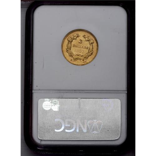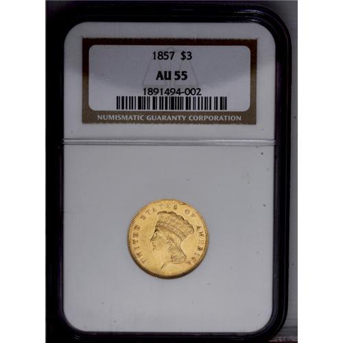<B>1857 $3 AU55 NGC.</B></I> A lightly circulated but nonetheless lovely representative. The 1857 is scarce in better circulated grades despite a plentiful (by the standards of the series) production of close to 21,000 pieces. Struck from boldly clashed dies. An inconspicuous planchet flaw is noted past 12 o'clock on the obverse.