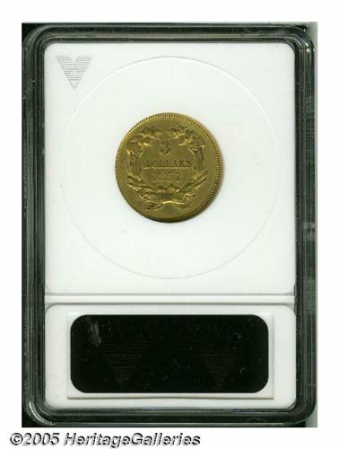 <B>1857<$3>--Cleaned--ANACS. AU Details, Net XF40.</B></I> A smooth but faintly hairlined example with straw-gold color and traces of subdued luster. A vertical pinscratch through the E in STATES is of little relevance.<BR><I>From the Dr. Kurt Peters Collection.</B></I> From the Dr. Kurt Peters Collection.
