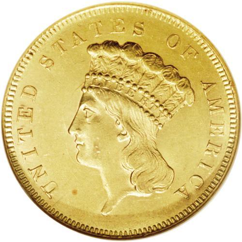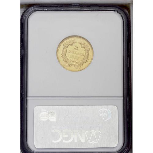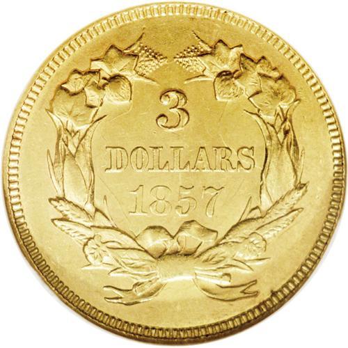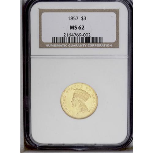 <B>1857<$3> MS62 NGC.</B></I> Fully lustrous and sharply detailed with satiny green-gold surfaces. Minor clash marks are visible in the fields on both sides, especially within the wreath on the reverse. From a limited mintage of 20,891 coins, although this is one of the higher mintages for the denomination. Over the 36-year history of this denomination, only 10 issues had business strike mintages exceeding 7,000 coins.