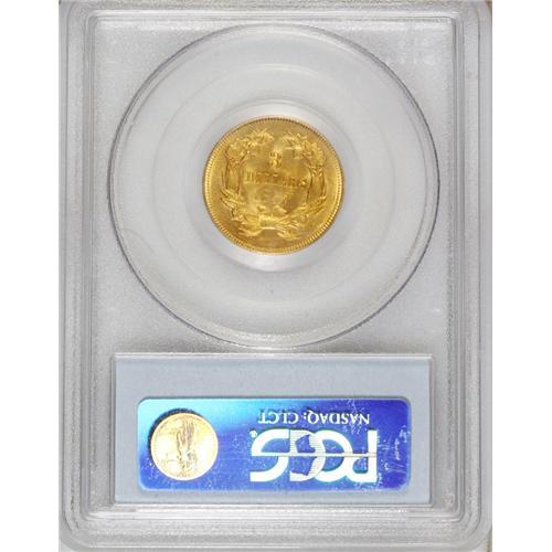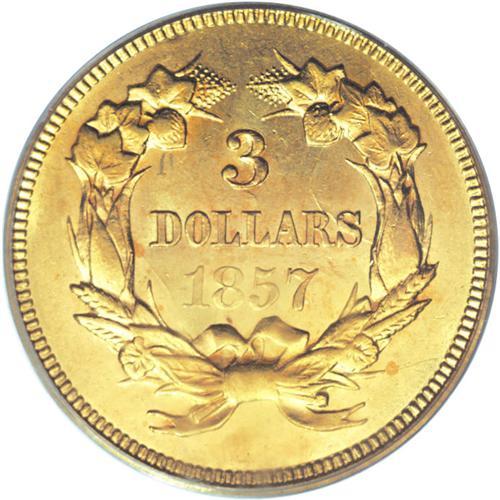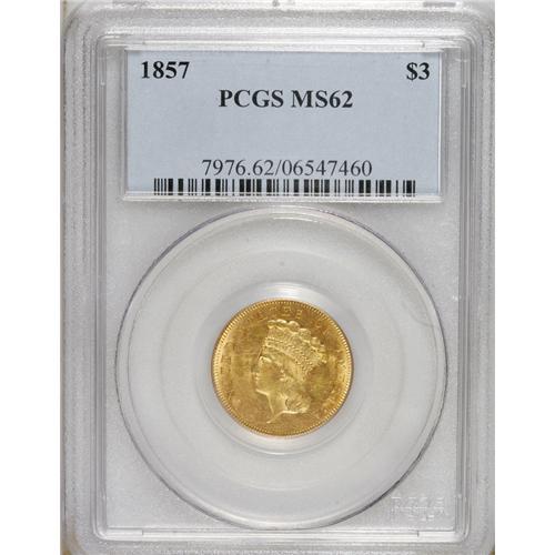 <B>1857 $3 MS62 PCGS.</B></I> One of the more available of the early dates in the three dollar series, the 1857 is usually found well circulated and strict Mint State coins are quite scarce. This MS62 piece displays some orange-golden color and faint die striations that are usually seen on high grade pieces of this issue. The strike is somewhat soft on the upper hair curls and bow knot. Minor obverse handling marks are noted. Population: 19 in 62, 15 finer (3/07).<BR><BR><b>Shipping:</b> Coins & Currency (<a target="_blank" href="http://www.heritageauctions.com/common/shipping.php">view shipping information</a>)