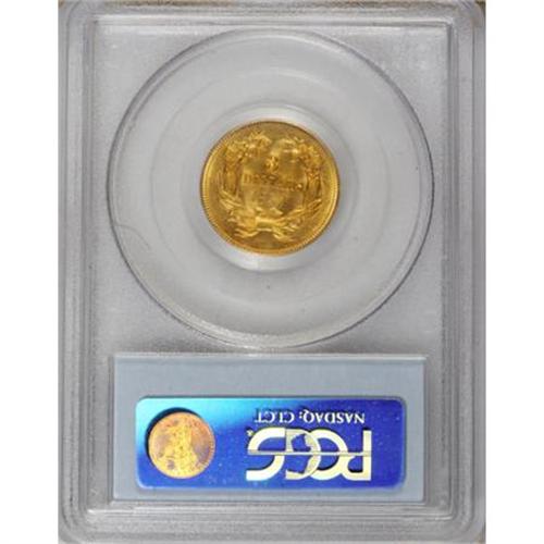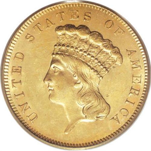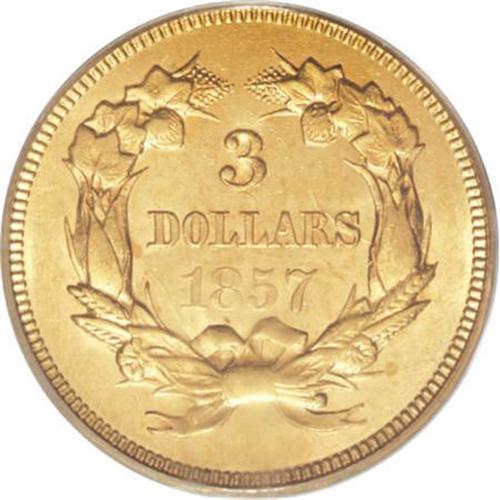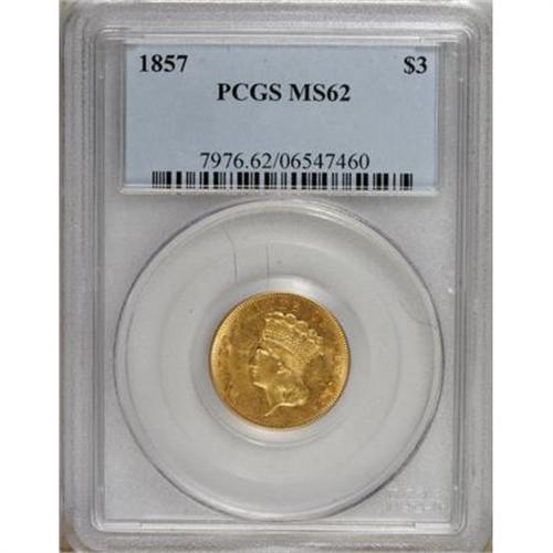 <B>1857 $3 MS62 PCGS.</B></I> One of the more available of the early dates in the three dollar series, the 1857 is usually found well circulated and strict Mint State coins are quite scarce. This MS62 piece displays some orange-golden color and faint die striations that are usually seen on high grade pieces of this issue. The strike is somewhat soft on the upper hair curls and bow knot. Minor obverse handling marks are noted. Population: 19 in 62, 15 finer (6/07).<BR><BR><b>Shipping:</b> Coins & Currency (<a target="_blank" href="http://www.heritageauctions.com/common/shipping.php">view shipping information</a>)