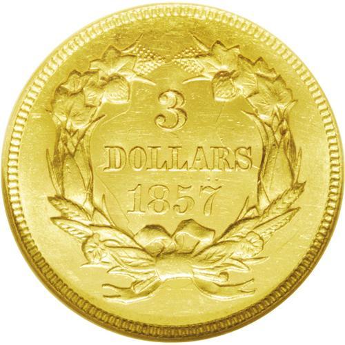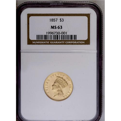 <B>1857<$3> MS63 NGC.</B></I> This is a lovely example with light yellow-gold luster and satiny surfaces. Both sides are lightly abraded, consistent with the grade. Minor clash marks can be seen in the fields. This is one of the available dates in the series, with a mintage of 20,891 coins. Although a seemingly small production, this is actually the eighth highest in the entire three dollar denomination. Census: 8 in 63, 10 finer (6/06).