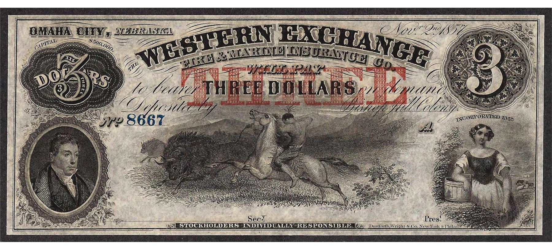 One 1857 $3 The Western Exchange Nebraska Obsolete Note.