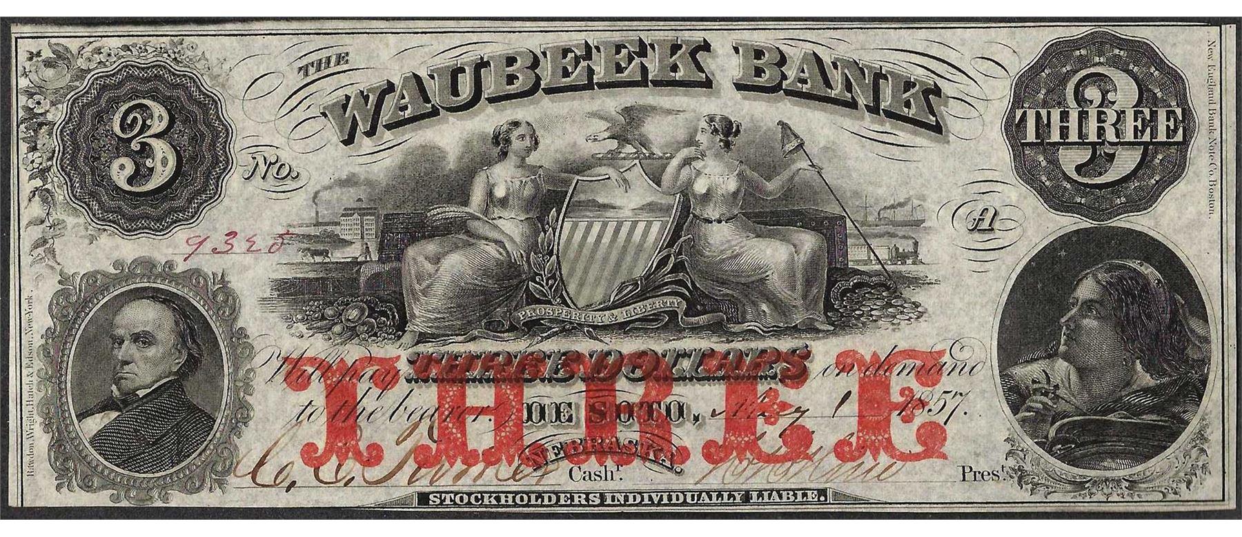 One 1857 $3 Waubeek Bank De Soto, NB Obsolete Note.