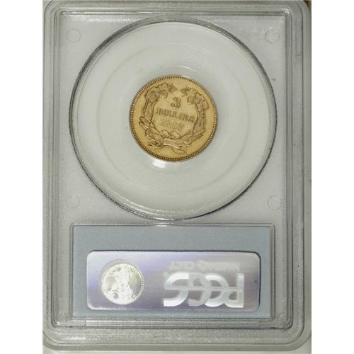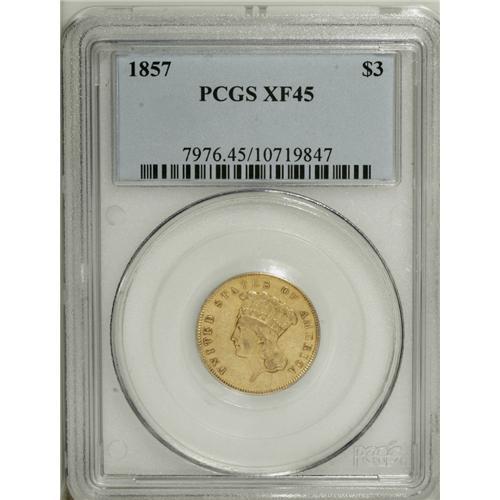 <B>1857 $3 XF45 PCGS.</B></I> The deep mustard-gold surfaces of this Choice XF piece retain a trace of peripheral luster. Lightly marked overall with interesting eye appeal.<BR><BR><b>Shipping:</b> Coins & Currency (<a target="_blank" href="http://www.heritageauctions.com/common/shipping.php">view shipping information</a>)
