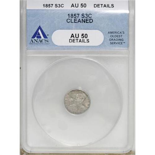 <B>1857 3CS --Cleaned--ANACS. AU50 Details.</B></I> NGC Census: (4/248). PCGS Population (6/227). Mintage: 1,042,000. Numismedia Wsl. Price for NGC/PCGS coin in AU50: $195. (#3673)<BR><BR><B>Coin Engraver:</B> James B. Longacre<BR><BR><b>Shipping:</b> Coins & Currency (<a target="_blank" href="http://www.heritageauctions.com/common/shipping.php">view shipping information</a>)