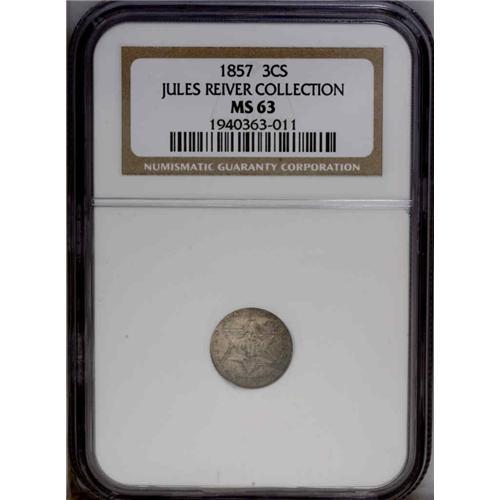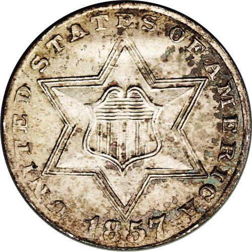 1857 3CS MS63 NGC. Lustrous surfaces. Pewter gray toni 1857[3CS] MS63 NGC.