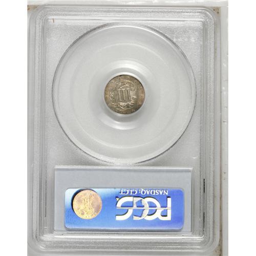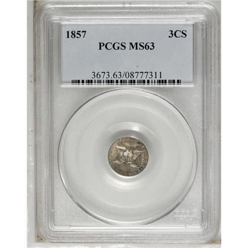 <B>1857<3CS> MS63 PCGS.</B></I> This example's average impression reveals isolated areas of striking weakness on both the obverse and the reverse. The blanket of variegated patina that adheres to both sides limits the visual impact of grade-defining pinscratches. A lovely piece, this coin should sell to a collector who appreciates originality above rarity.