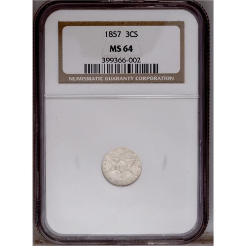 <B>1857<3CS> MS64 NGC.</B></I> A brilliant near-Gem that is well struck in the centers, while the borders have minor softness of definition. The fields are beautifully preserved, but have very noticeable clash marks.