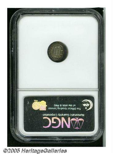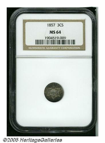 <B>1857<3CS> MS64 NGC.</B></I> This near-Gem Trime features steel-blue, lavender, and golden-brown patination around the borders, framing near-brilliant centers. The design elements are generally well struck. A few miniscule reverse marks limit the grade. Population: 76 in 64, 44 finer (5/05).