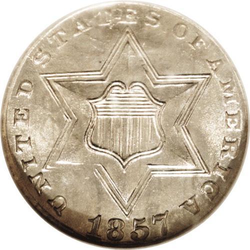<B>1857 3CS MS65 NGC.</B></I> Sharply struck and fully lustrous with exquisite surfaces and bright silver luster. Both sides have heavy clash marks and severe die bulges, with peripheral obverse die cracks. This is the scarce Type II design with a two-line border around the star. Census: 31 in 65, 12 finer (1/06).