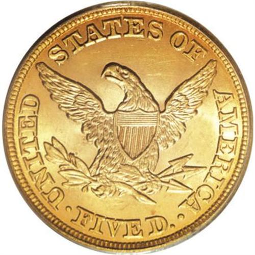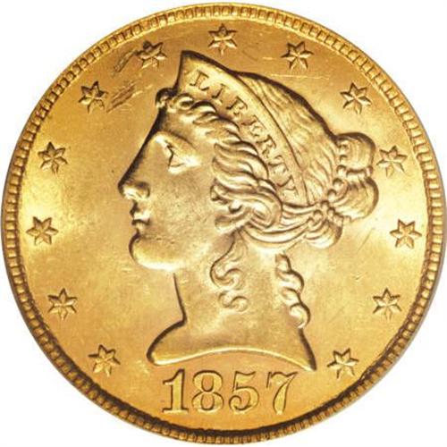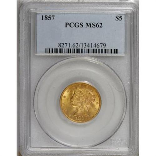 <B>1857 $5 MS62 PCGS.</B></I> Even though 98,188 pieces were struck of the 1857, it was not widely saved at the time of issue. Similarly, it is often an overlooked date by all but the most serious 19th century gold specialists. In spite of the MS62 grade, the main attraction of this coin is its outstanding mint luster. The luster is thick and softly frosted, the same one would expect on a Gem coin. A few small abrasions are peppered over each side, which account for the grade. Sharply and evenly defined on each side. Population: 14 in 62, 15 finer (8/07).<BR><BR><B>Coin Engraver:</B> Christian Gobrecht<BR><BR><b>Shipping:</b> Coins & Currency (<a target="_blank" href="http://www.heritageauctions.com/common/shipping.php">view shipping information</a>)