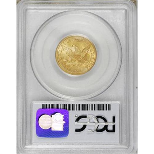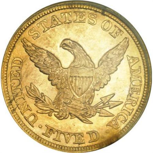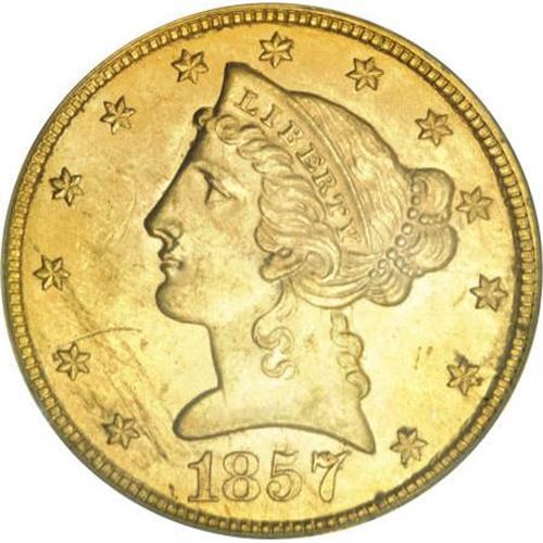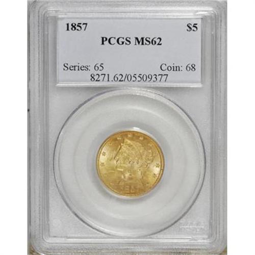 <B>1857 $5 MS62 PCGS.</B></I> A minor scratch extending from star 2 into the field towards Liberty's chin resulted in the MS62 grade of this otherwise Select Uncirculated coin. The 1857 five is rare in Mint State, but of course the scant mintage of just 98,188 coins makes it a scarce coin in any grade. Lustrous surfaces and overall originality are the most positive characteristics of this example. Population: 14 in 62, 15 finer (12/07).<BR><BR><B>Coin Engraver:</B> Christian Gobrecht<BR><BR><b>Shipping:</b> Coins & Currency (<a target="_blank" href="http://www.heritageauctions.com/common/shipping.php">view shipping information</a>)