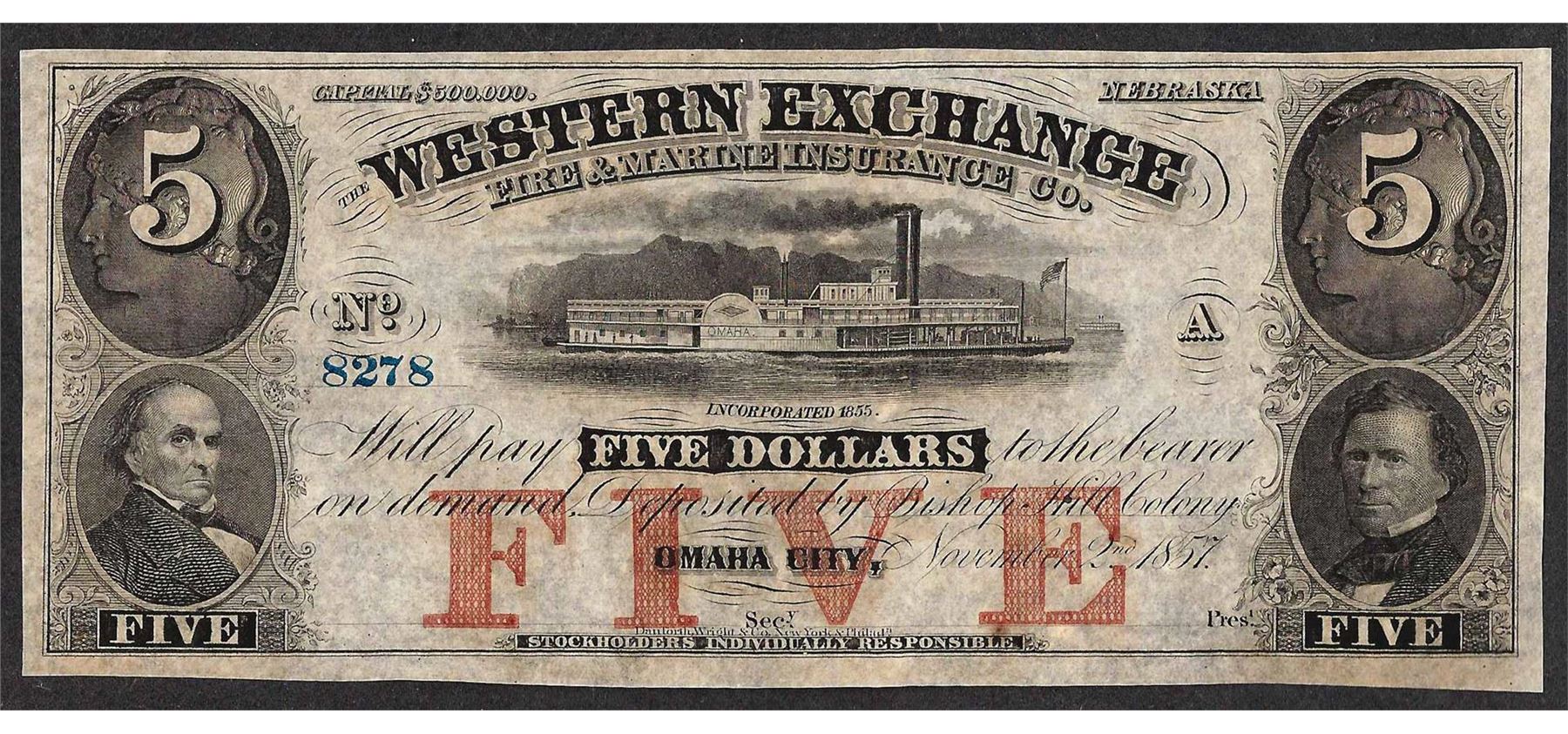 One 1857 $5 The Western Exchange Nebraska Obsolete Note.