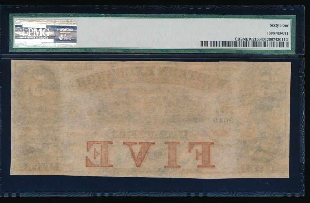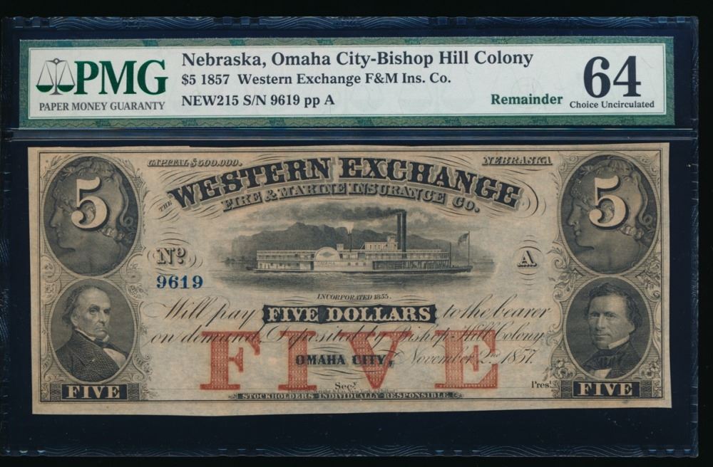 One 1857 $5 Western Exchange Obsolete Note PMG 64.