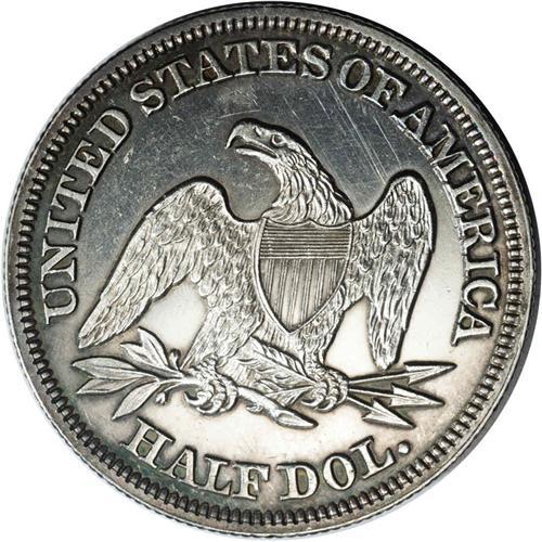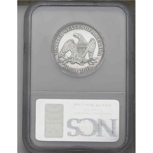 <B>1857<50C>--Improperly Cleaned--NCS. Unc. Details.</B></I> Bright from a relatively mild polishing, this intricately struck example is lightly toned and has detectable hairlines only on the field near the eagle's beak. Traces of chocolate-brown, rose, and sea-green color outline design elements near the rims.