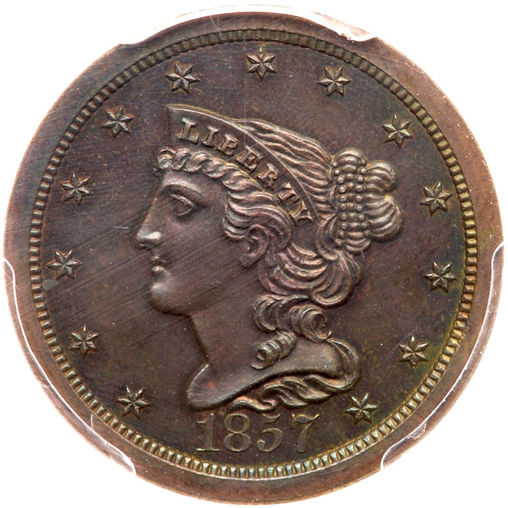 1857 Breen 1-B doubled T in CENT R4 PCGS graded PR66 Brown. Reverse of 1856. Beautiful deep purple with underlying faded mint red covering a third of the reverse. The fields are nicely reflective with moderate to deep mirrors on both sides. This piece offers outstanding eye appeal, especially the obverse, and the designs are needle-sharp. The best identifying mark is a tiny spot of lighter blue steel toning left of star 3. Our grade is Proof-64+, very close to gem. Weight 83.8 grains. The attribution as Breen-2 is shown on the PCGS label. PCGS population 1, the finest in BN. PCGS #1332 . Estimated Value 10,000 - UP