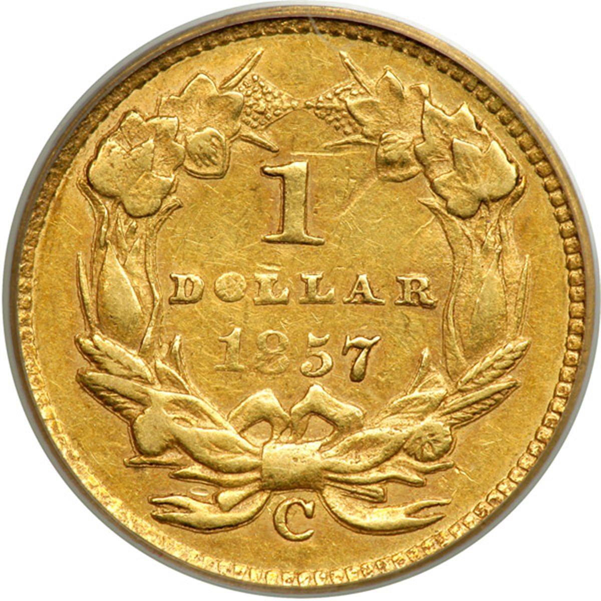 1857-C $1 Gold Indian. PCGS graded EF-45 CAC Approved. Honey color gold with some obverse clash marks as made. Only 13,280 minted of which merely 175 are estimated to have survived. Pop 32; 59 finer (PCGS # 7545) .