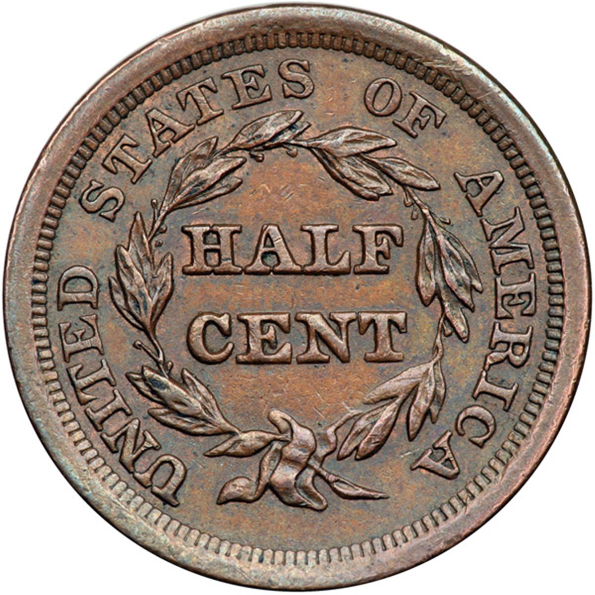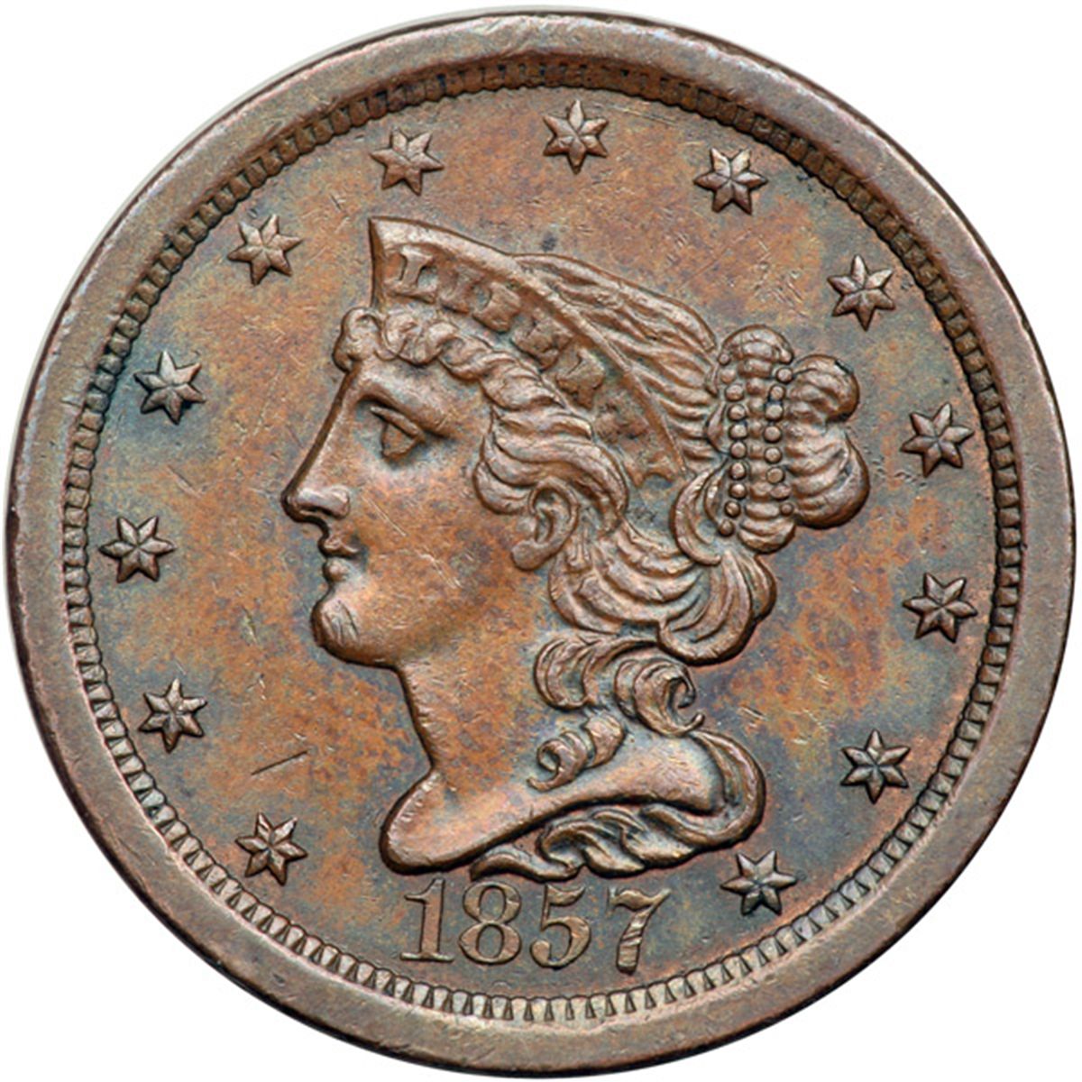 1857 C-1 R2 EF45. Five points sharper but there are a few tiny nicks on the tip of the chin, and these are easy to miss. The best identifying mark is a short diagonal struck-through line in the field above star 1 (where a tiny piece of wire or thread got between the die and planchet during striking). Frosty medium brown with light bluish olive with hints of very faded mint color in a couple of the protected areas. Sharply struck EDS. Great eye appeal for the grade.