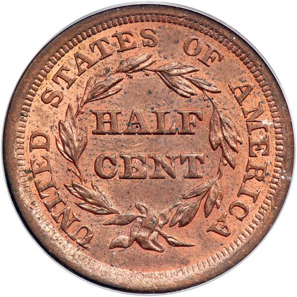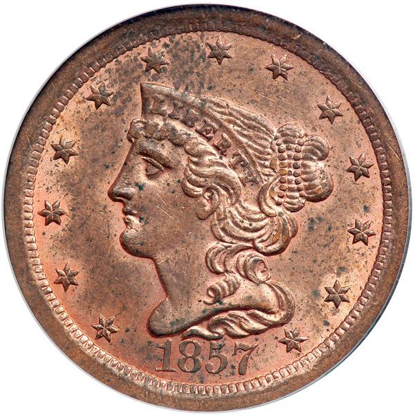 1857 C-1 R2. PCGS graded MS-62 Red & Brown. Frosty mint red fading to olive and steel brown, more than half the bright mint color remaining. Most of the toning is in the form of tiny specks and there are traces of an old fingerprint at stars 5-7. A couple microscopic specks of carbon can be found at HA in HALF. MDS. Our grade is consistent with the slab grade. The attribution is noted on the PCGS label. PCGS population 1; the only example graded at PCGS for the variety.