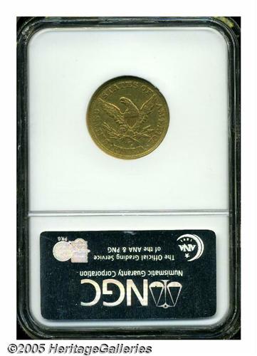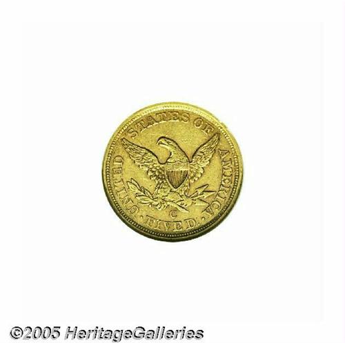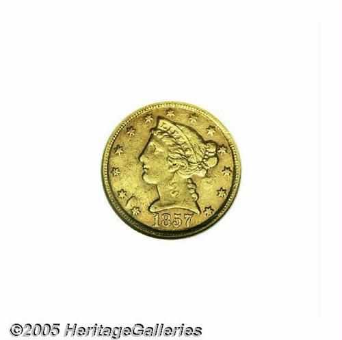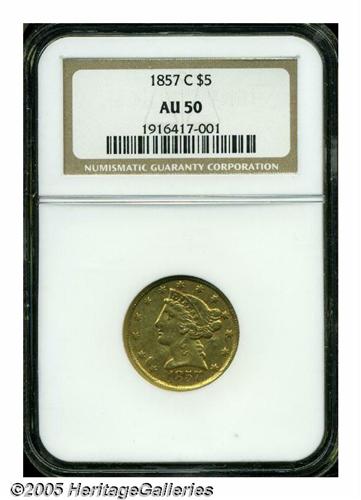 <B>1857-C<$5> AU50 NGC.</B></I> Variety 25-J, the only known die pairing. A pleasing, wholly original example of this C-mint issue, with muted gold surfaces that are typically abraded for the issue. This piece appears to have been struck from a very late die state, as the obverse die is badly buckled with several ridges and depressions visible in the fields. Although this issue is relatively common for the Charlotte mint, uncleaned specimens are becoming more difficult to locate as more coins are dipped and stripped of their original surfaces in efforts to get them certified at higher grades.