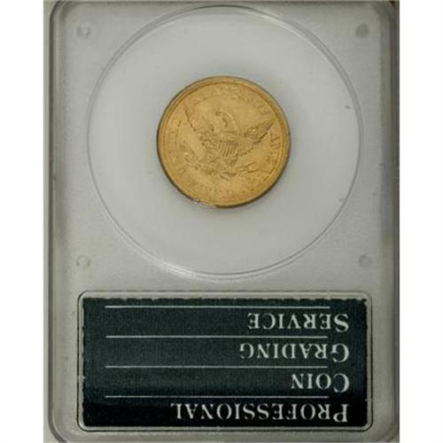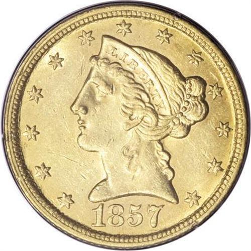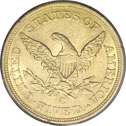 <B>1857-C $5 AU55 PCGS.</B></I> Nicely impressed for the date with both the obverse and the reverse showing nearly full detail in the centers; the borders are just a bit weak as always seen. There are two noticeable marks on the obverse. The first is a fairly deep cut that can be seen in back of the eye; the second is a long, thin horizontal mark in the left obverse field. The reverse is clean and choice. Almost no actual wear can be seen and the luster is frosty and undisturbed. Both sides show nice, rich orange-gold color with a hint of rose seen on the reverse. This color appears to be totally original and this coin has not been dipped or processed. Despite the aforementioned marks on the obverse, this is a nice coin and it would might well upgrade if resubmitted as it has the body and appearance of an AU58 to MS60. Housed in an old PCGS holder.<BR> The 1857-C is among the more common half eagles from this mint, making it a good date for type purposes. There may be as many as 200-250 pieces known but many grade below AU. Around four dozen are in the various AU grades and there are as many as a 10 to 12 coins in Uncirculated. Interestingly, nearly all of the Uncirculated pieces grade MS60 to MS61, and this date is exceedingly rare in MS63 or better. The finest known is the Elrod coin which now seems to be in an NGC MS65 holder (it was graded MS64 by NGC when last sold by Heritage as lot 4797 in the 2003 FUN auction). The second finest is the Milas coin that is now graded MS63 by PCGS.<BR><I>From The Carolina Circle Collection.</B></I><BR><BR><B>Coin Engraver:</B> Christian Gobrecht<BR><BR><b>Shipping:</b> Coins & Currency (<a target="_blank" href="http://www.heritageauctions.com/common/shipping.php">view shipping information</a>)