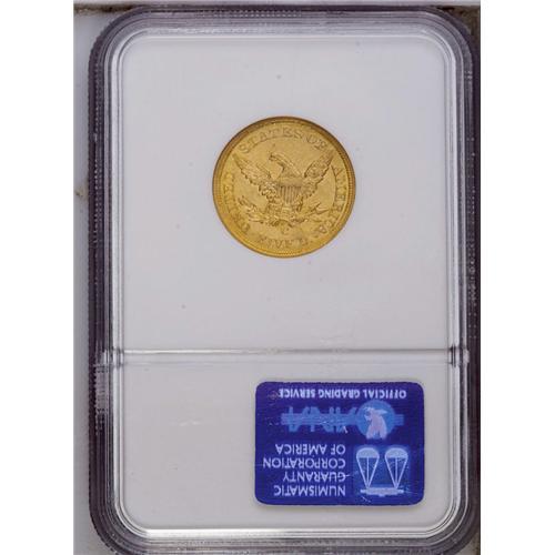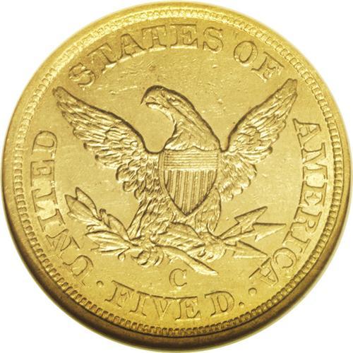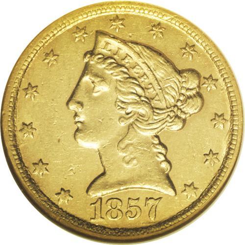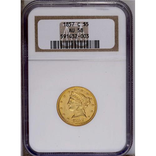 <B>1857-C<$5> AU58 NGC.</B></I> Variety 25-J. A relatively available issue within the Charlotte half eagle series. It is most often seen in VF and XF grades; lower quality AU pieces are obtainable with little trouble, but high-end AUs are more difficult. The AU58 coin presented here displays attractive peach-gold color and retains ample luster. A few minute abrasions are scattered about, including shallow linear marks on the eagle's neck, and a pinscratch above the eagle's right (left facing) wing. Census: 42 in 58, 18 finer (3/06).