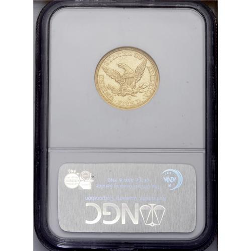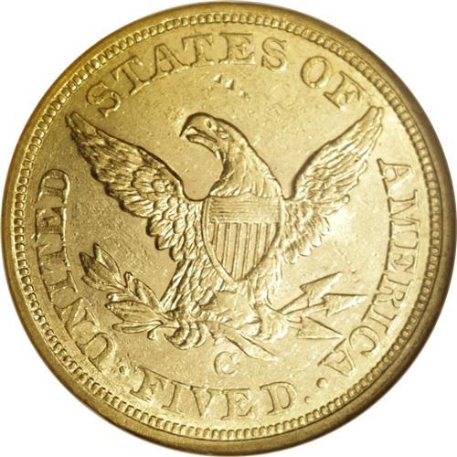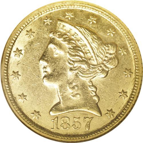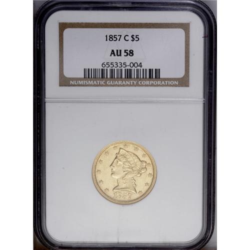 <B>1857-C $5 AU58 NGC.</B></I> Variety 25-J. Bright yellow-gold with virtually complete luster and only minor striking softness on the reverse, nearly expected of the issue. A pair of criss-crossing pinscratches below Liberty's chin are the only distraction of merit. Although the 1857-C is an obtainable issue by Charlotte Mint standards (at least 175-225 pieces survive) and can without major difficulty be located in AU grades, pieces that boldly approach or reach Mint State status are nevertheless scarce and eagerly sought by collectors of Southern gold. Census: 43 in 58, 17 finer (1/06).
