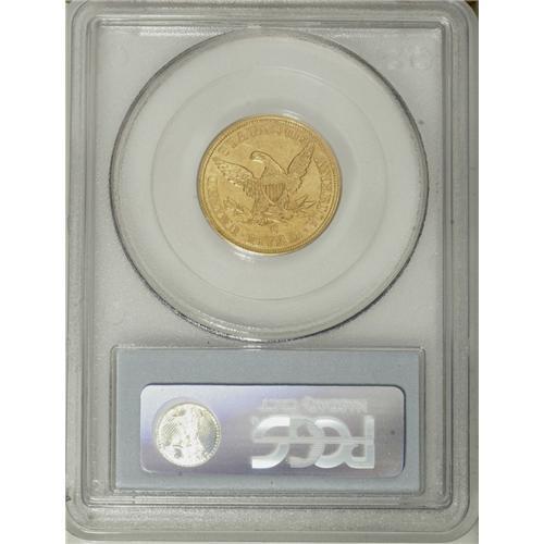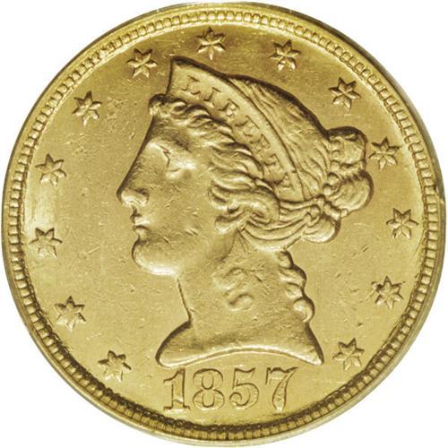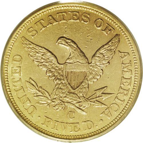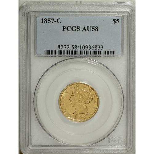 <B>1857-C $5 AU58 PCGS.</B></I> Variety 25-J. Luster brightens the borders and devices of this attractive near-Mint Charlotte gold coin. The reverse is surprisingly unabraded, while the obverse has only a few distributed ticks. Generally sharp throughout, particularly given the mint of origin. Population: 11 in 58, 10 finer (11/06).<BR><BR><b>Shipping:</b> Coin/Currency (<a target="_blank" href="http://www.heritageauctions.com/common/shipping.php">view shipping information</a>)