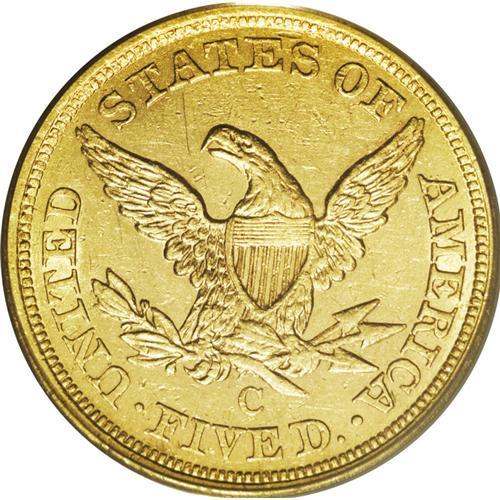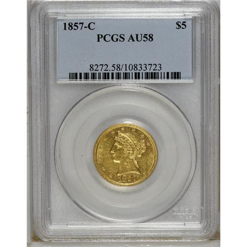 <B>1857-C $5 AU58 PCGS.</B></I> Variety 25-J. The strike is pleasing overall, with moderate softness only on the lovelock and the lower obverse dentils. Luster is particularly extensive on the reverse. Unblemished apart from a light vertical mark on the cheek. Only 31,360 pieces were struck. Population: 9 in 58, 10 finer (10/06).<BR><BR><b>Shipping:</b> Coin/Currency (<a target="_blank" href="http://www.heritageauctions.com/common/shipping.php">view shipping information</a>)