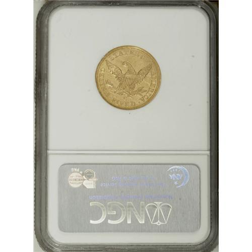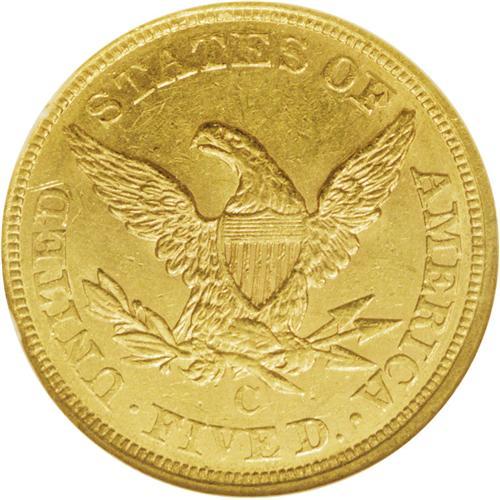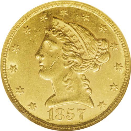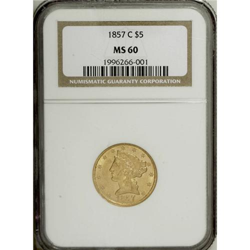 <B>1857-C $5 MS60 NGC.</B></I> Variety 25-J. Well struck considering the mint of origin, and bright luster is prevalent across the devices and peripheries. Clean for the grade apart from a diagonal thin mark on the cheek. A typically low mintage year for Charlotte, with only 31,360 half eagles struck. Census: 3 in 60, 16 finer (11/06).<BR><BR><b>Shipping:</b> Coin/Currency (<a target="_blank" href="http://www.heritageauctions.com/common/shipping.php">view shipping information</a>)