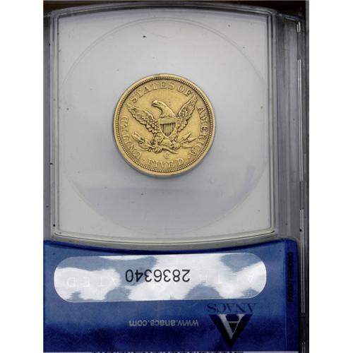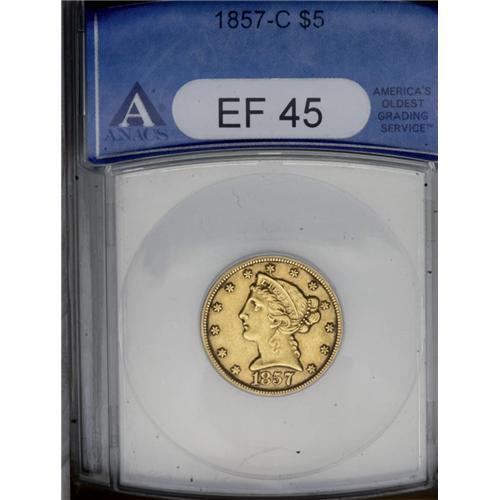 <B>1857-C<$5> XF45 ANACS.</B></I> Variety 25-J. An attractively defined golden-brown C-mint half eagle with minor striking softness only on Liberty's lovelock and the eagle's neck and fletchings. Light marks near the 7 in the date are usual for the grade.