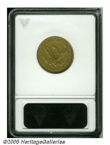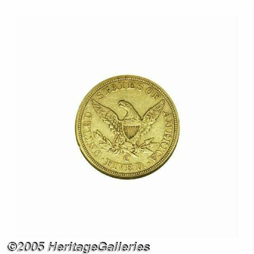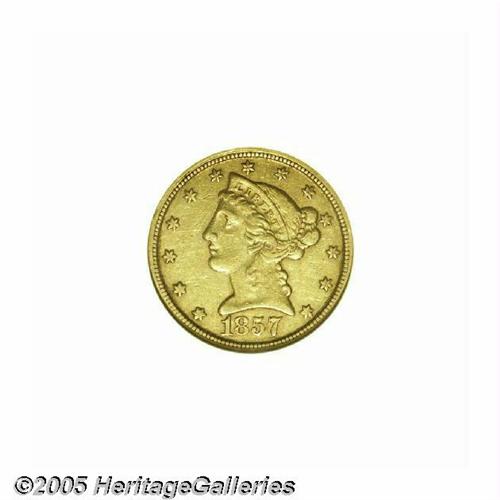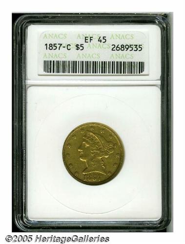 <B>1857-C<$5> XF45 ANACS.</B></I> Variety 25-J, the only known die pairing. This is a plentiful issue from a generous mintage of 31,360 coins. Although other Charlotte Mint issues have higher mintages, this remains one of the more common and readily available dates for the type collector or the casual numismatist. Pleasing greenish-gold with slight surface marks, consistent with the grade. Perhaps cleaned long ago, but now with an entirely natural appearance.