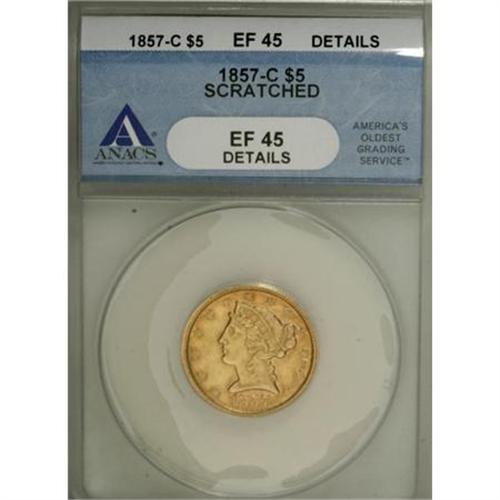 <B>1857-C $5 --Scratched--ANACS. XF45 Details.</B></I> Variety 25-J. Boldly struck overall, with minor weakness noted on the obverse stars. Both sides retain considerable luster and only show slight wear on the highpoints. A pair of intersecting scratches are noted in the right obverse field, just below Liberty's cap. <BR><I>Ex: The Greenwich Collection (Bowers and Merena, 1/91), lot 176.</B></I><BR><I>From The John Stimson, Sr. Collection, Part Two.</B></I><BR><BR><B>Coin Engraver:</B> Christian Gobrecht<BR><BR><b>Shipping:</b> Coins & Currency (<a target="_blank" href="http://www.heritageauctions.com/common/shipping.php">view shipping information</a>)
