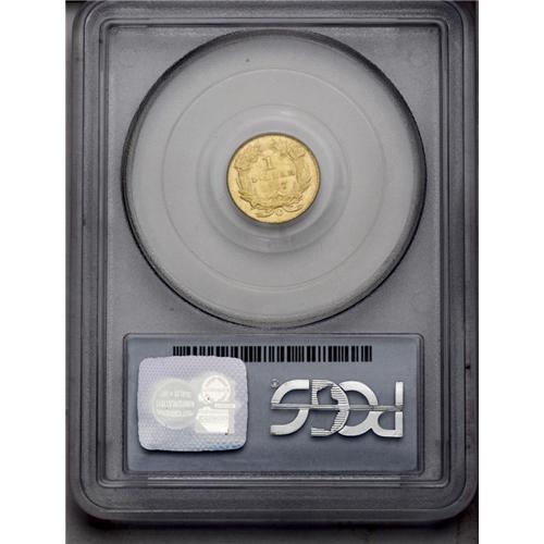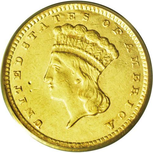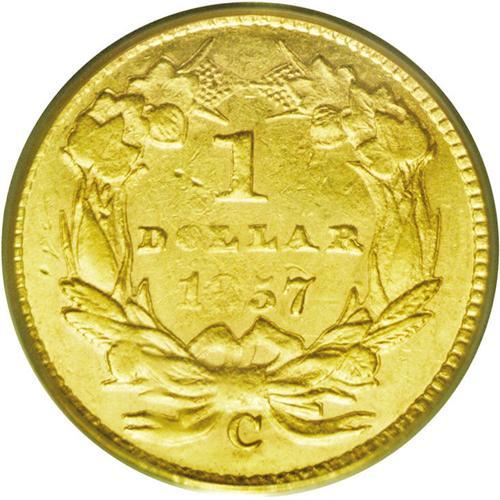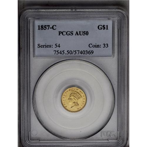 <B>1857-C<G$1> AU50 PCGS.</B></I> Variety 10-L. This issue is known both for poor planchets and poorer striking quality. This example shows some planchet roughness and irregular dentilation from 4 to 6 o'clock on the obverse, as often found. The central strike is weak on the reverse, with the O in DOLLAR and the 8 in the date only partially visible. Ample luster remains, however, and there is not that much actual wear on the coin. A couple of curious short scrapes have deeper, ball-shaped indentations at one end, in front of Liberty's face. The surfaces are a pretty medium gold. Population: 22 in 50, 34 finer (5/06).