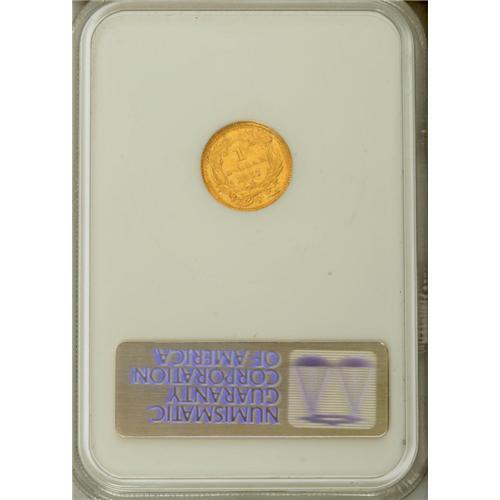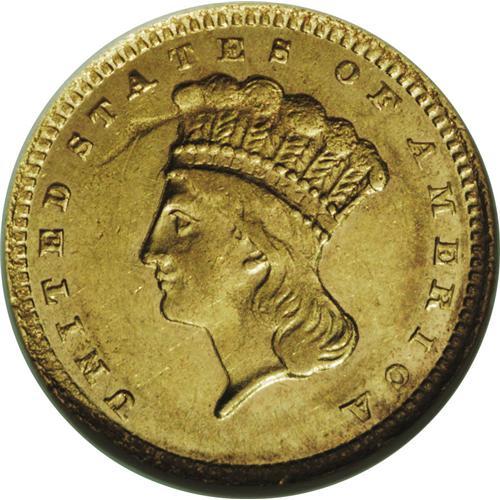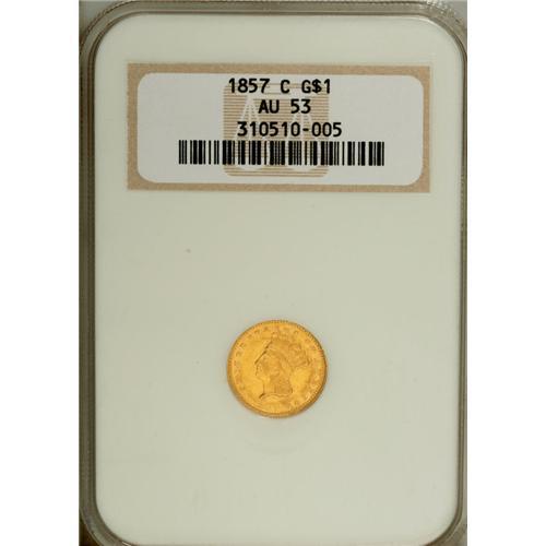 <B>1857-C G$1 AU53 NGC.</B></I> Variety 10-L. The first of only two Type Three gold dollar issues produced by the Charlotte Mint. Compared to most extant examples, this still-lustrous yellow-gold piece has solid detail, though the planchet displays a rough mint-made depression to the left of the lightly worn headdress. Pleasing overall, and one of just 13,280 pieces minted.<BR><I>From The Twin Hollows Collection.</B></I><BR><BR><b>Shipping:</b> Coin/Currency (<a target="_blank" href="http://www.heritageauctions.com/common/shipping.php">view shipping information</a>)