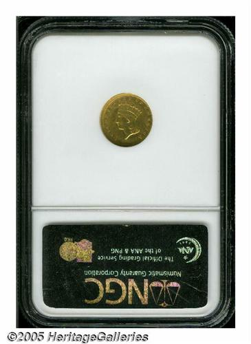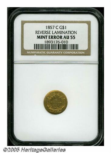 <B>1857-C<G$1> AU55 NGC.</B></I> Variety 10-L. While identified as a mint error by NGC, we have chosen to include this difficult Charlotte Gold Dollar in the regular gold session. Part of our reasoning is the consistently poor quality of planchets used for the issue, which makes the major lamination on the left reverse border of this coin more of a normality than an oddity. The strike is reasonably sharp for a '57-C and subtle reddish patina highlights the still-lustrous surfaces. One of just 13,280 pieces struck and a especially desirable C-mint in grades approaching Mint State. Population: 24 in 55, 37 finer (5/05).